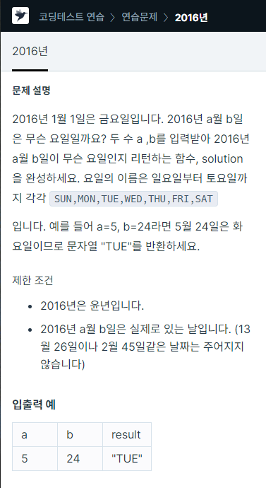 프로그래머스 레벨1 2016년 (자바) 출처: 프로그래머스 모든 문제 레벨 1 https://programmers.co.kr/learn/challenges