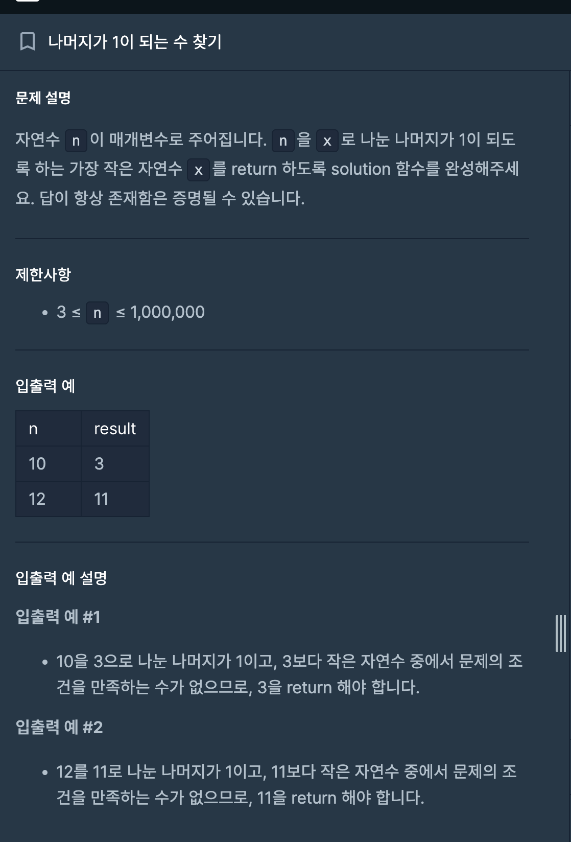 프로그래머스 https://school.programmers.co.kr/learn/courses/30/lessons/87389 'n을 x로 나눈 나머지가 1이 되도록하는 가장 작은 자연수 x'를 구하는 문제입니다.